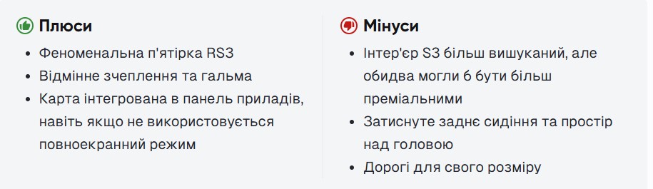 RS3 — це вибір серцем. Вона дарує музику вихлопу, адреналін у поворотах і відчуття справжнього спортивного характеру. А S3 — це вибір розумом, який теж не дасть засумувати.