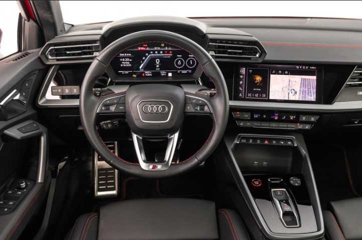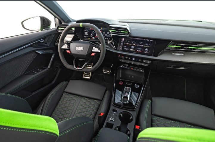 RS3 одразу привертає увагу: агресивний передній бампер, зухвалий погляд фар і той самий «сквіркл» — кермо незвичної форми між квадратом і колом. Усередині — мінімалізм та екрани, жодних справжніх кнопок, на відміну від S3. Така собі ціна за сучасність.