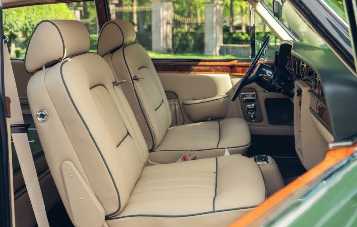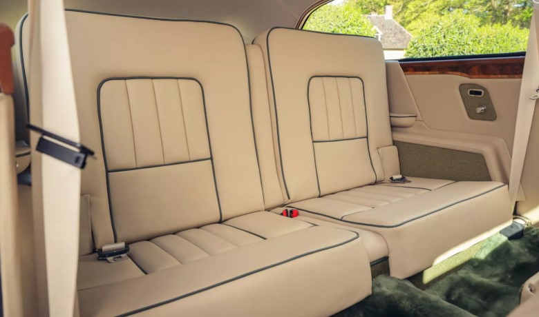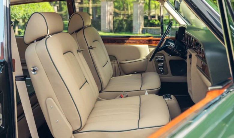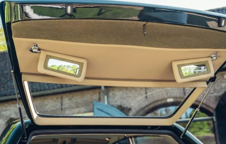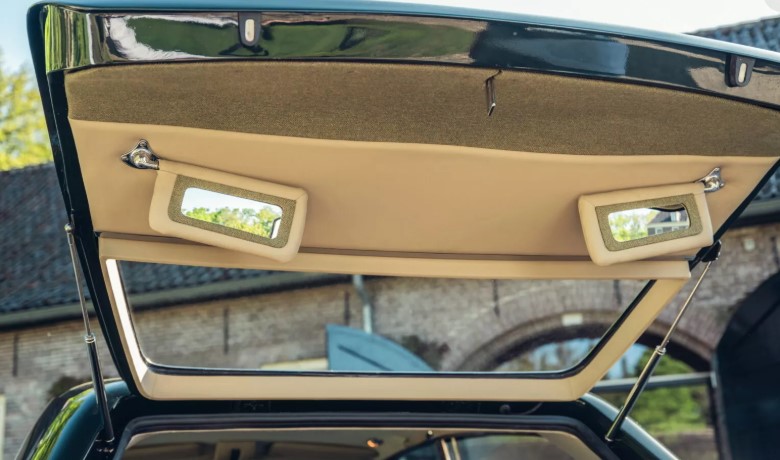 Всередині салон повністю відреставровано, зберігши оригінальну дерев’яну панель приладів. Нова обшивка з бежевої шкіри гармонійно поєднується з зеленими акцентами, оливковим килимом та м’якими килимками з ягнячої вовни.