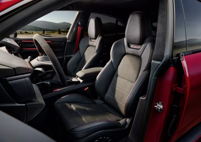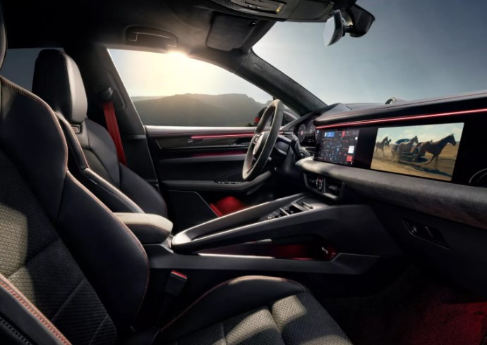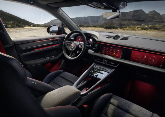 Салон Porsche Macan Electric GTS оздоблений матеріалом Race-Tex і чорною шкірою. Покупці можуть підібрати колір прострочки під відтінок кузова — якщо обрали Carmine Red, Slate Gray Neo або Lugano Blue. Логотип GTS можна побачити на кермі, спортивних сидіннях із 18-рівневим регулюванням і в графіці цифрової панелі приладів.