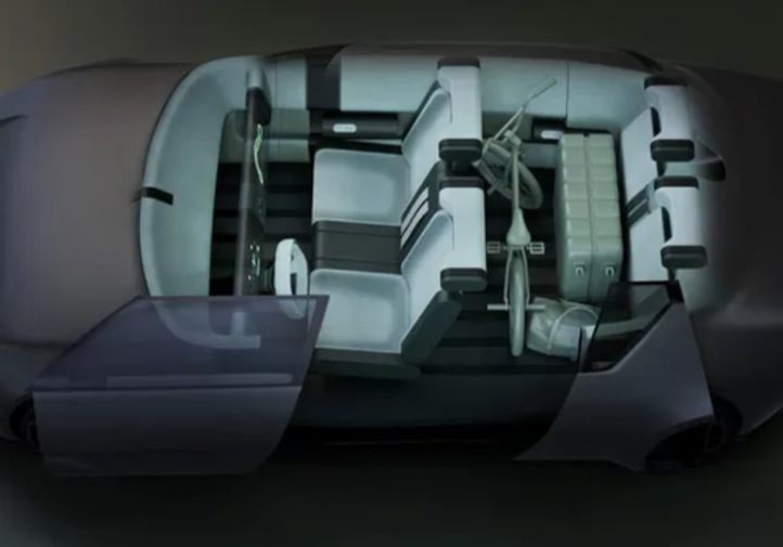 На передній панелі тепер скляний дисплей, на який проєктуються віртуальні прилади — відсилання до класичної панелі MBX. Центральної консолі немає, як і в оригіналі.