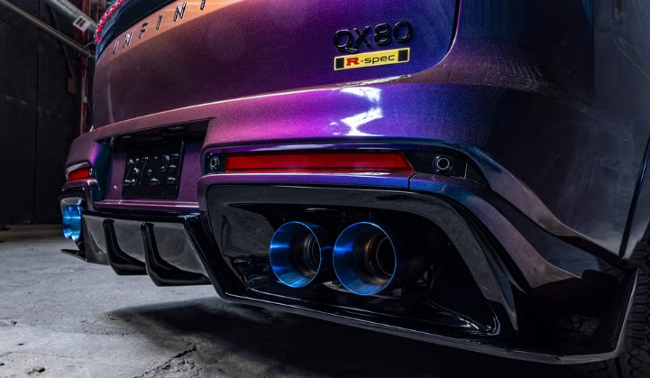Розширені колісні арки та знижена посадка надають QX80 зловісного вигляду. Ззаду з’явився дифузор, величезні чотири вихлопні труби та виступаючий спойлер.