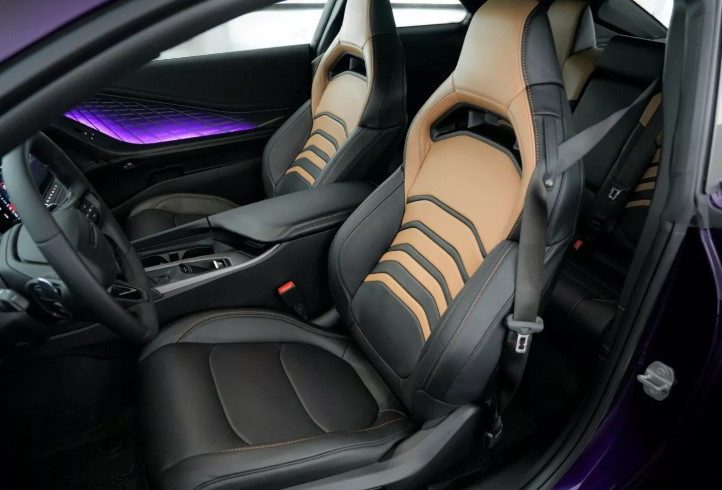 Салон також отримав апгрейд: сидіння оббиті шкірою Katzkin із поєднанням чорного Tuscany Ink та світлого Palomino tan. Для яскравих акцентів у салоні додано помаранчеву та фіолетову прострочку.