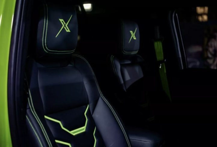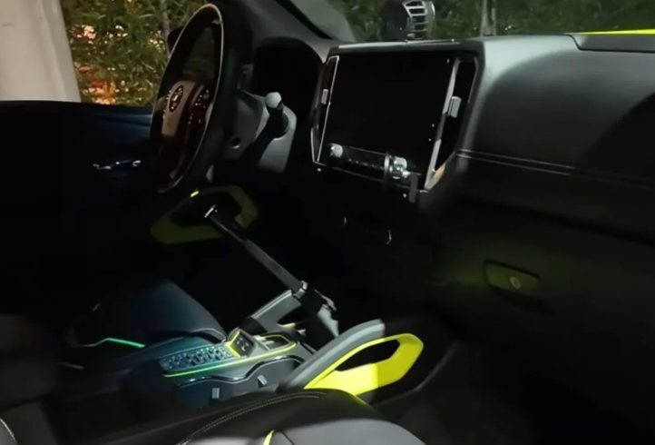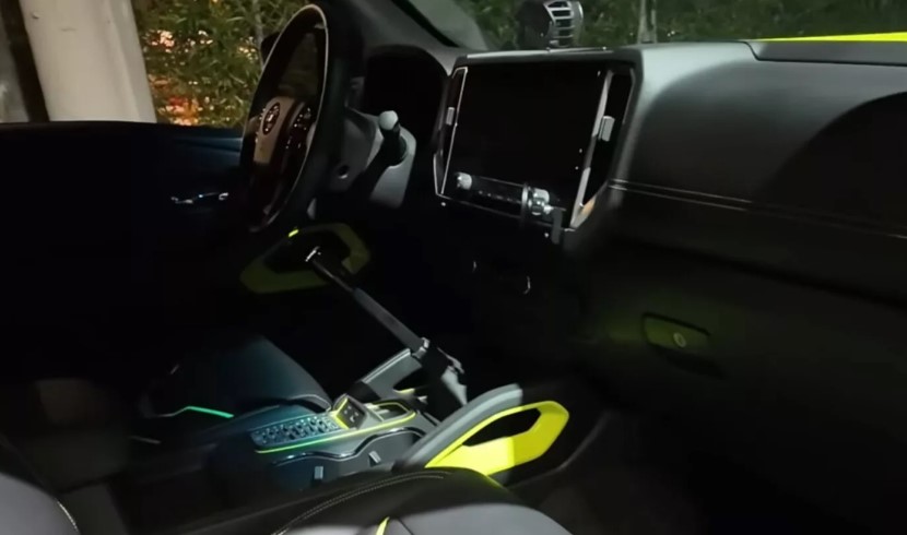 Салон виконано в чорній шкірі з яскравими вставками Citrus Strike. Навіть ремені безпеки підібрані в тон, а чорна стеля додає стилю. На підлозі — практичні килимки WeatherTech, а у багажнику — міцне покриття Inyati Bedliners, яке захищає від подряпин і бруду.