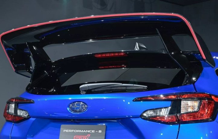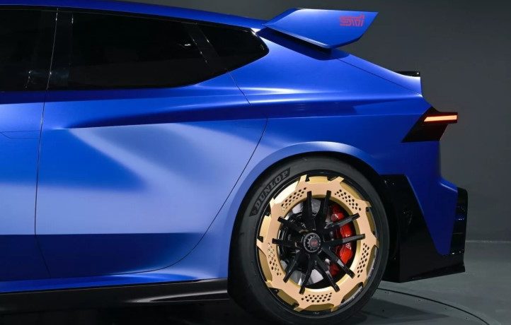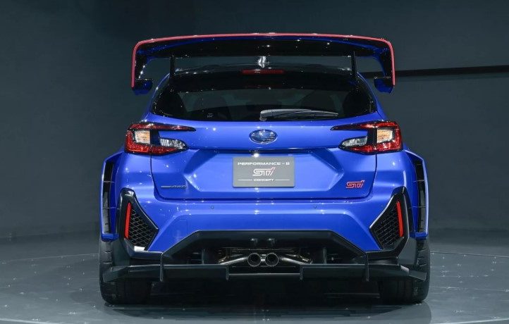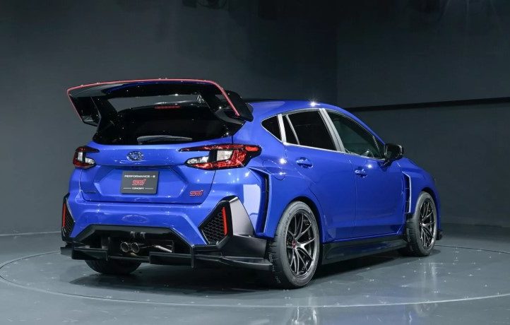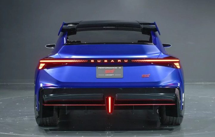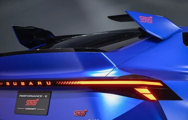 Похилі лінії даху STI Performance-E плавно переходять у стильний “качиний хвіст” зі спойлером, який має два вертикальні плавці замість традиційного крила. Унизу — масивний дифузор із гальмівним вогнем у стилі болідів Формули-1.