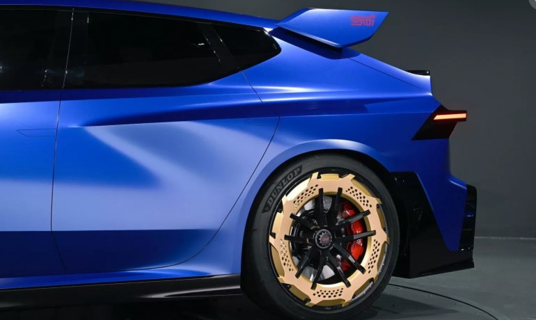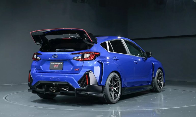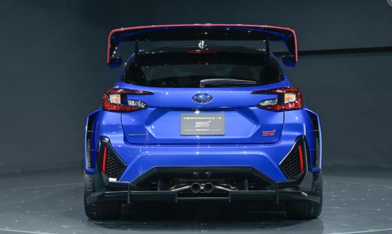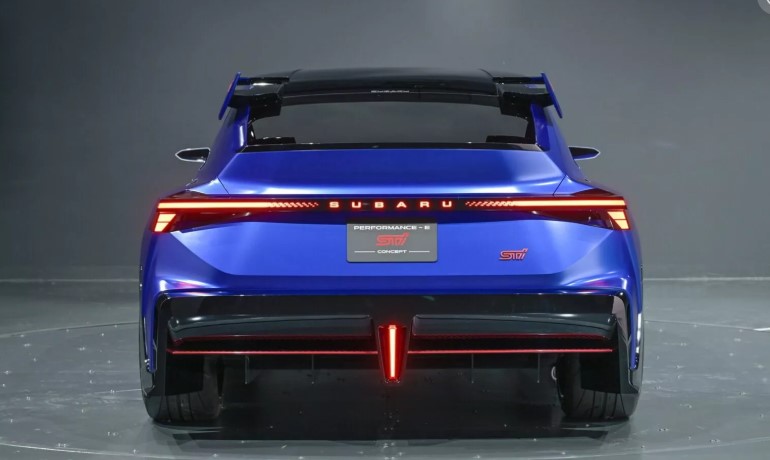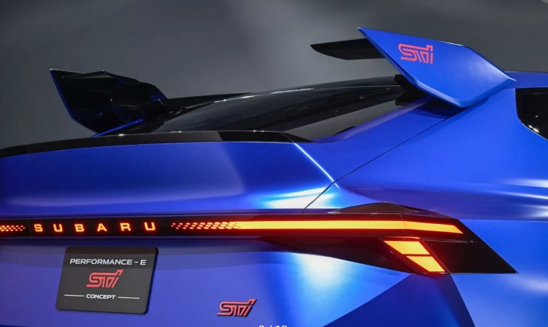 Похилі лінії даху STI Performance-E плавно переходять у стильний “качиний хвіст” зі спойлером, який має два вертикальні плавці замість традиційного крила. Унизу — масивний дифузор із гальмівним вогнем у стилі болідів Формули-1.
