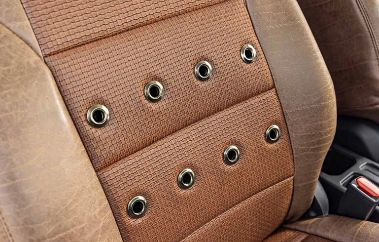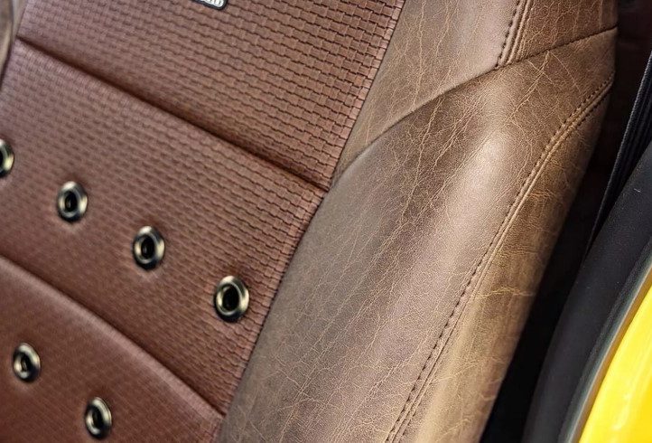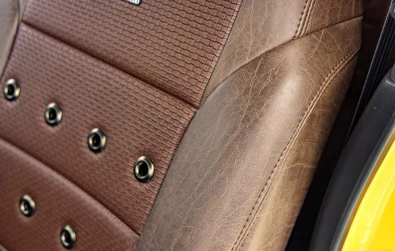 Всередині — чохли на сидіння у стилі ретро, кольору Cognac Brown або Charcoal Black. Вони поєднують шкіру з плетеними вставками та мають додаткові кишені ззаду.