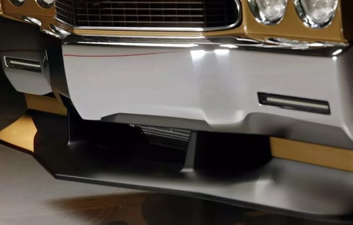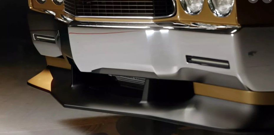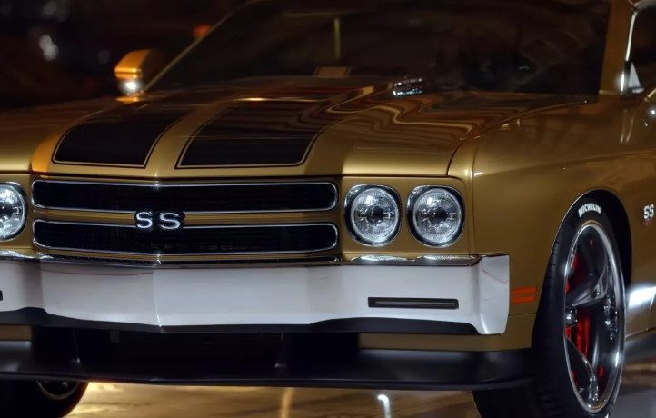 Спереду авто отримало новий хромований бампер, фірмову решітку радіатора та круглі фари, як в оригінальної Chevelle SS. Колір кузова — Autumn Gold, той самий, що мав історичний Pilot Car. Уздовж капота тягнуться чорні гоночні смуги, які підкреслюють спортивний характер машини.