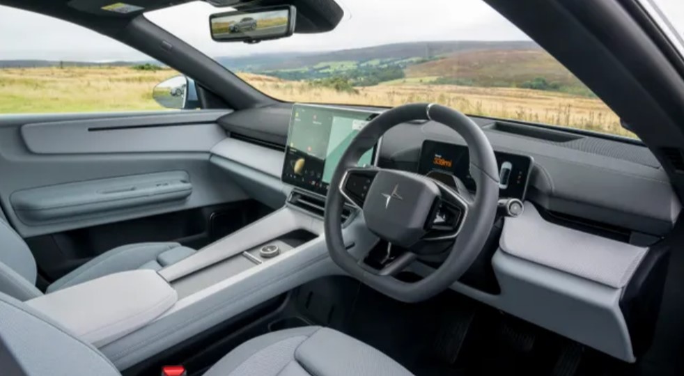 Через вузьку, обтічну форму корми заднє вікно вийшло б занадто маленьким, а дзеркало заднього виду — схожим на «щілинку». Тому Polestar замінила його ширококутною камерою, яка транслює зображення на екран у місці, де зазвичай знаходиться дзеркало. «Звикнете», — кажуть у Polestar. Ми — не звикли. Зображення розташоване занадто близько до очей, тому потрібно змінювати фокус і рухати погляд, тоді як у справжньому дзеркалі фокус залишається спільним із дорогою попереду. Тож, як і водії фургонів, ви більше покладатиметеся на бокові дзеркала.