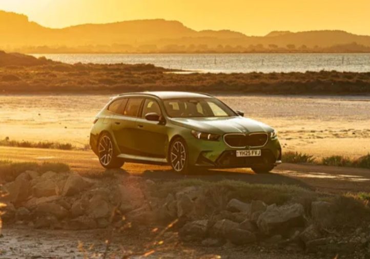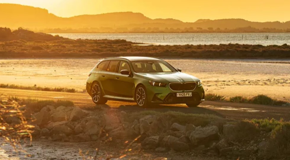 BMW M5 тепер у гібридному виконанні. Автомобіль важкий, але має непоганий вигляд, особливо на світанку. Світло м’яко згладжує великі форми машини та робить її менш масивною.