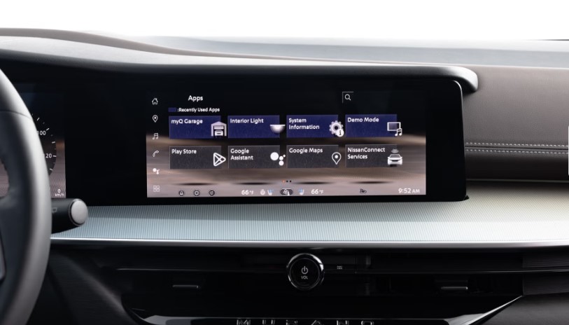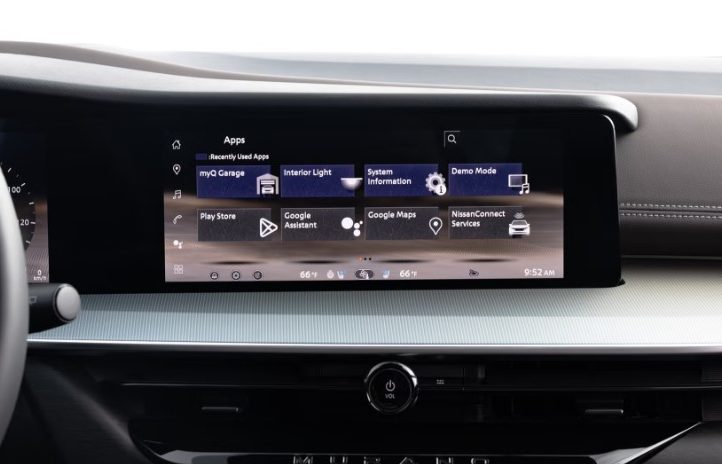 Салон тепер більше схожий на Ariya: великий 12,3-дюймовий екран з Google Built-In, окремий дисплей водія та кольоровий head-up display. Клавіші на сенсорній панелі, імітуючій дерево, створюють відчуття преміальності, а музичні ноти при включенні машини додають атмосферності.