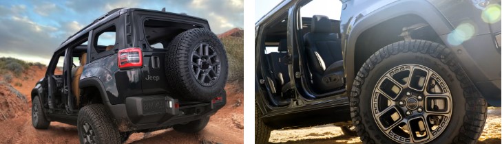 Wrangler має суцільні передню та задню осі, блоковані диференціали, двошвидкісну роздавальну коробку та доступні шини 35 дюймів для всіх типів поверхні.