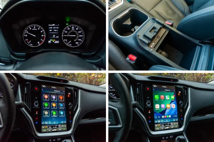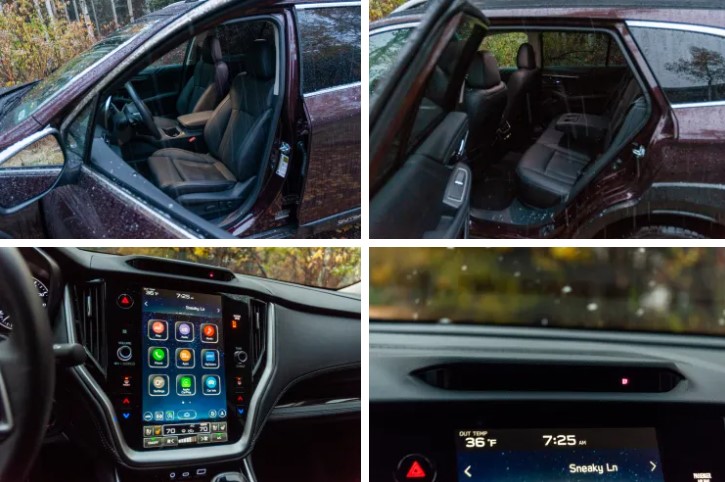 Попри свій вік, сучасний Outback виглядає переважно сучасним. Сенсорний екран у портретній орієнтації діагоналлю 11,6 дюйма великий і підтримує бездротові Apple CarPlay та Android Auto. У тестованій версії Touring XT є чотири USB-порти, підігрів передніх і задніх сидінь, а також інфрачервона камера, яка стежить за очима водія, щоб переконатися, що він не відволікається на телефон під час руху.