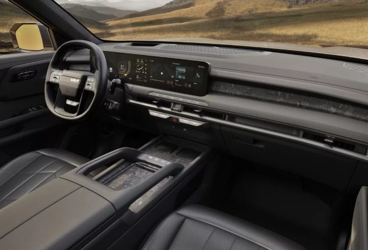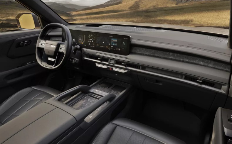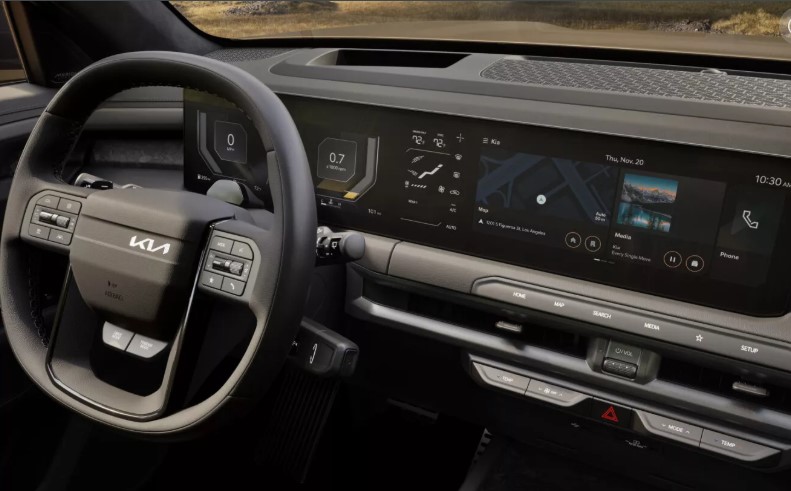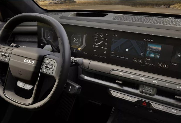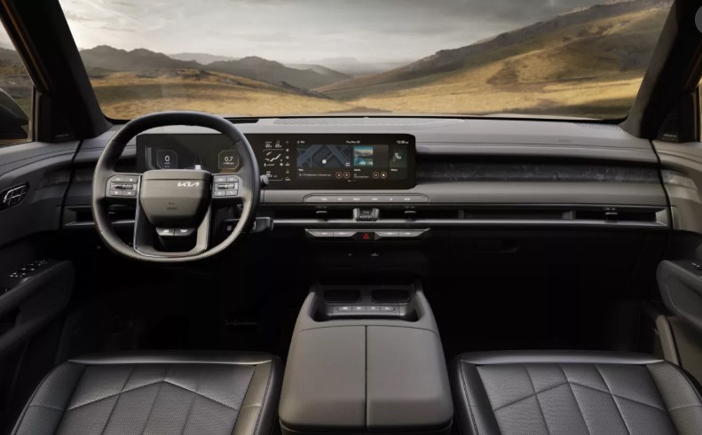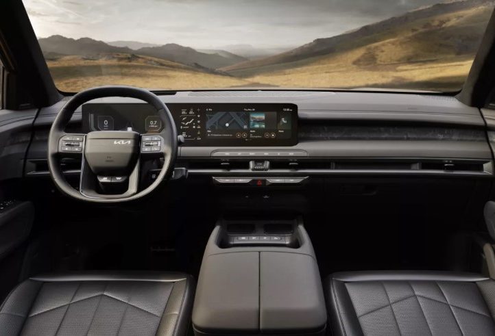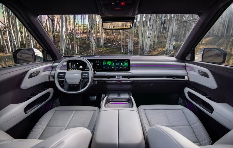 Всередині новий Telluride, який конкурує з Ford Explorer, черпає натхнення від EV9. Панель із двома 12,3-дюймовими екранами тепер має чітко прямокутну форму.