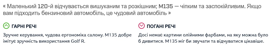 Салон комфортний і зручний, навіть базова версія приємна в керуванні. M135 xDrive додає потужності, але не перетворює машину на повністю “гарячу”. Це розкішний швидкий хетчбек, який радує водінням, але не дає повного хот-хетчевського драйву.