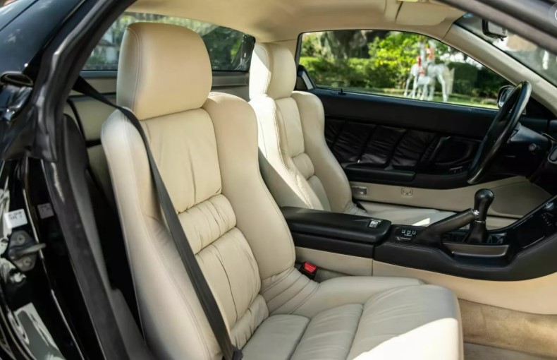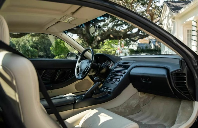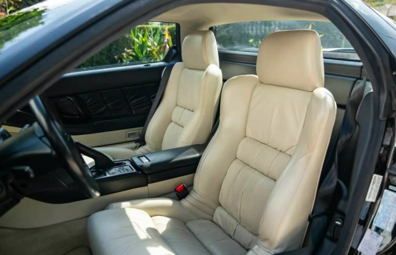 Салон також виглядає дуже добре. Сидіння типу «ковш», нижня частина тунелю коробки передач і дверні панелі обшиті шкірою кольору слонової кістки, яка зберегла свій вигляд навіть після років експлуатації. Чорна панель приладів теж у відмінному стані та не має серйозних тріщин.