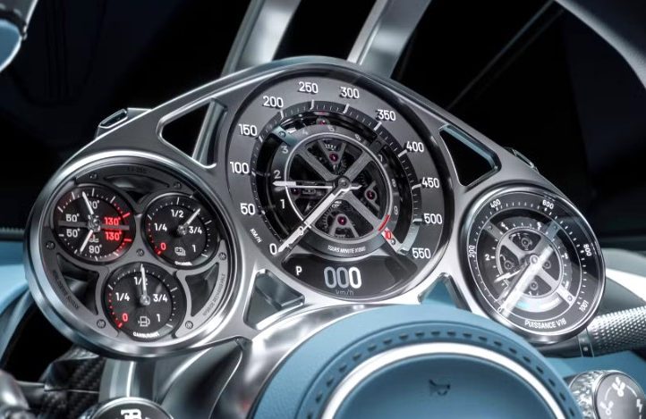 Приладова панель — справжня перлина інтер’єру. Вона оточена кермом, яке ніби «літає» навколо, з алюмінієвими спицями, що не перекривають жодного важливого покажчика. Кожен інструмент аналоговий, створений швейцарськими майстрами-годинникарями. Коли кермо обертається, прилади залишаються на місці, нагадуючи дорогий швейцарський годинник. І як у швейцарських годинниках, скло теж сапфірове.