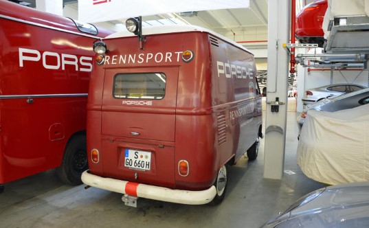 Porsche ніколи не випускала комерційні фургони, тому для перегонових команд використовувала техніку інших брендів. Найчастіше обирали Volkswagen Bus — надійний, простий і недорогий в експлуатації. Цей екземпляр Porsche доопрацювала самостійно: підняла дах, щоб перевозити більше обладнання. Такого кузова Volkswagen серійно ніколи не пропонувала.