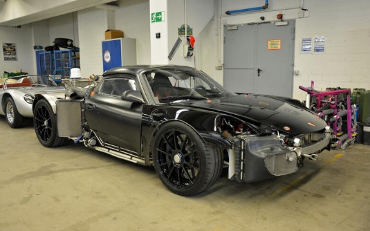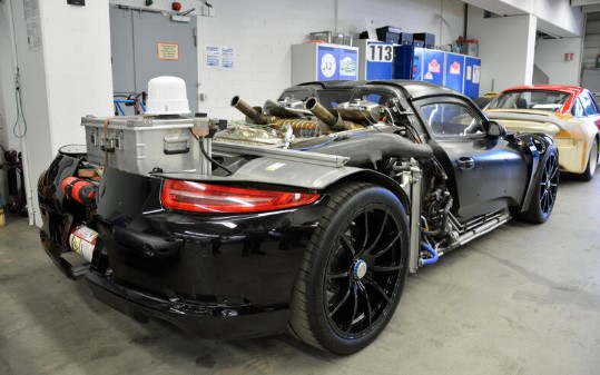 Це не реквізит із постапокаліптичного фільму, а справжній тестовий «мул». Інженери встановили майже серійні вузли 918 Spyder у сильно перероблений кузов Carrera GT.Штатну оптику використати не вдалося, тож спереду закріпили прості маленькі LED-фари просто під краєм капота.