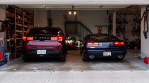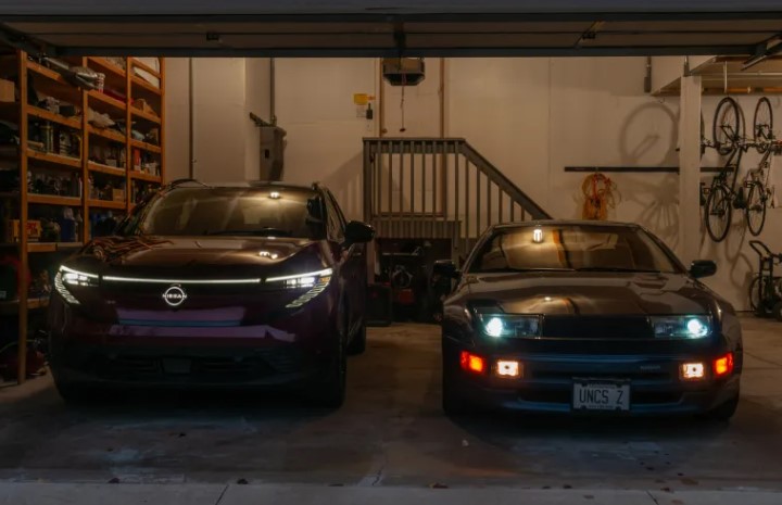Синій Nissan 300ZX 1990 року (Z32), який ви бачите на фото, стоїть у моєму гаражі. Поруч — Nissan Leaf 2026 року, який я тестував цілий тиждень.