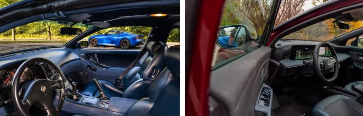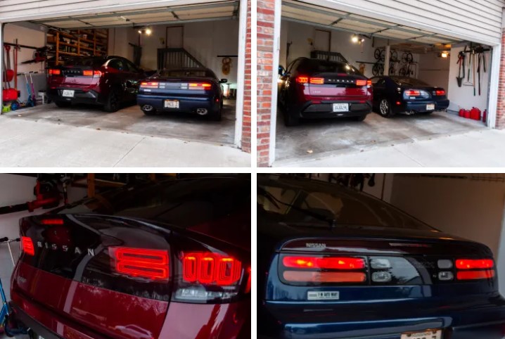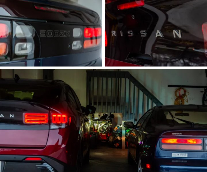 На перший погляд, найбільш помітна подібність між двома машинами — це форма задніх ліхтарів. Ліхтарі Z32 явно надихнули дизайн LED-овалів на Leaf. Горизонтальні елементи EV нагадують ходові, стоп-сигнали та поворотники Z32, а вертикальні овали схожі на ліхтарі заднього ходу, тільки трохи коротші.