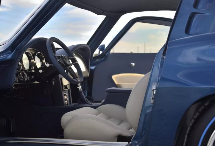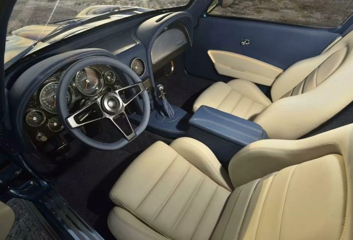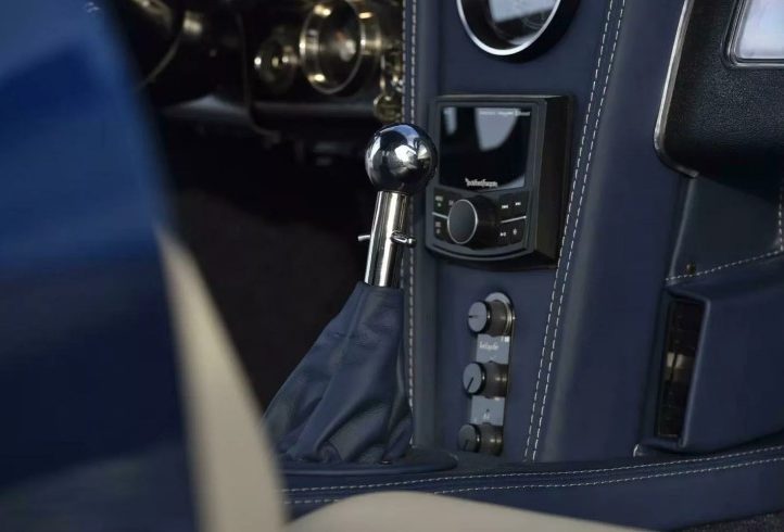 Всередині Stingray поєднує розкіш і спортивність: шкіра Douglas, сидіння Sparco, панель приладів Dakota Digital з автографом Брока, сучасний кондиціонер Vintage Air і сучасна шумоізоляція. Тут рідкісний баланс між зручністю та чистим задумом автомобіля.