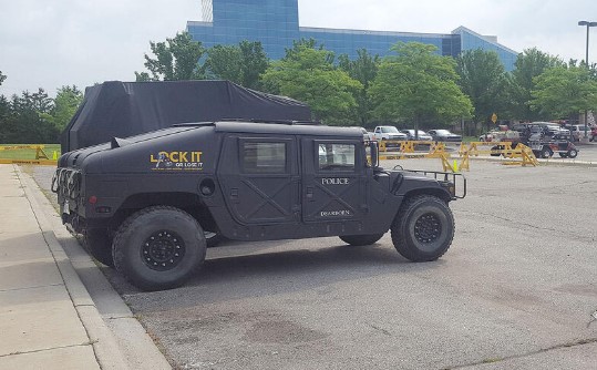 Humvee у департаменті поліції Дірборна, ймовірно, колишній військовий. Багато іншого спорядження, що надійшло до поліції після виведення військ з Іраку та Афганістану.