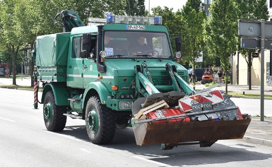 Німецький Mercedes-Benz Unimog із 1948 року служить пожежникам, лісникам та поліції. Ця модель 2017 року мала передній ковш і використовувалась для забезпечення порядку під час саміту G20 у Гамбурзі.