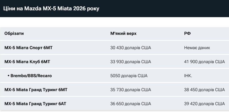 Підвищення ціни поширюється на всю модельну лінійку, яка стала компактнішою у 2026 році. Це не дивно, адже 35th Anniversary Edition зникає з асортименту. Miata залишається доступною та впізнаваною, хоча й із невеликими косметичними змінами.