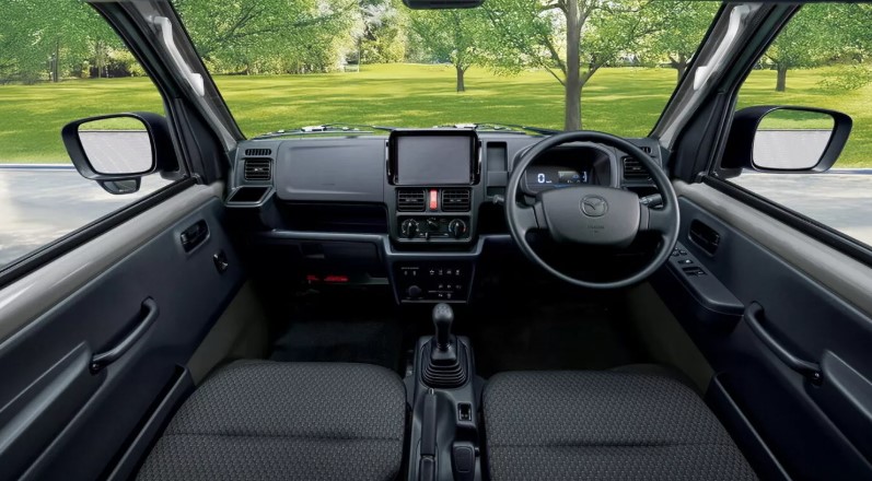 Усередині Mazda Scrum Truck змін майже немає — і це цілком очікувано. Передня панель, як і раніше, виконана з твердого пластику, з фізичними кнопками та перемикачами по всій площині. Стандартного мультимедійного екрана немає.