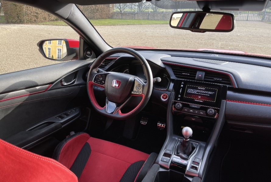 Салон Honda Civic Type R FK8 трохи незвичний, матеріали середньої якості, але оснащення багате. Деякі можуть не любити електронне стоянкове гальмо.