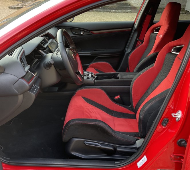 Спортивні крісла Honda Civic Type R FK8 добре тримають тіло, а салон залишається зручним. У режимі «+R» кермо і амортизатори жорсткіші, але авто лишається контрольованим.