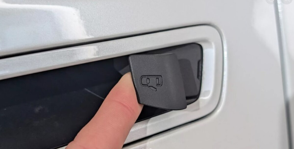 Поруч із язичком передбачено знімну секцію під замкову щілину. Якщо електричний кросовер повністю втратить живлення, потрапити всередину можна цілком традиційним способом: вставити ключ, задіяти механічний замок і відкрити двері вручну.