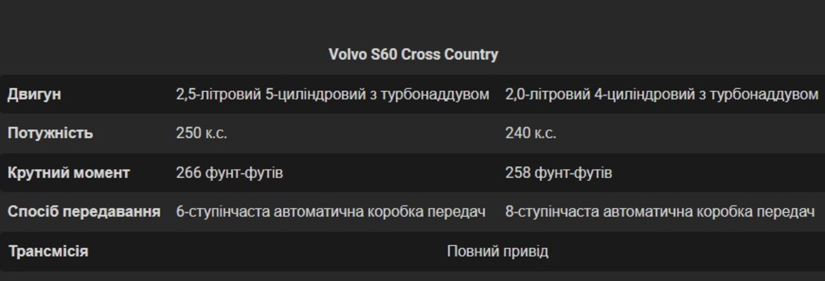 Під капотом Volvo S60 Cross Country фактично ховається той самий Volvo S60. З точки зору двигуна та трансмісії це звичайний седан S60, тому будь-які технічні питання або типові проблеми тут майже повністю збігаються зі стандартною моделлю.