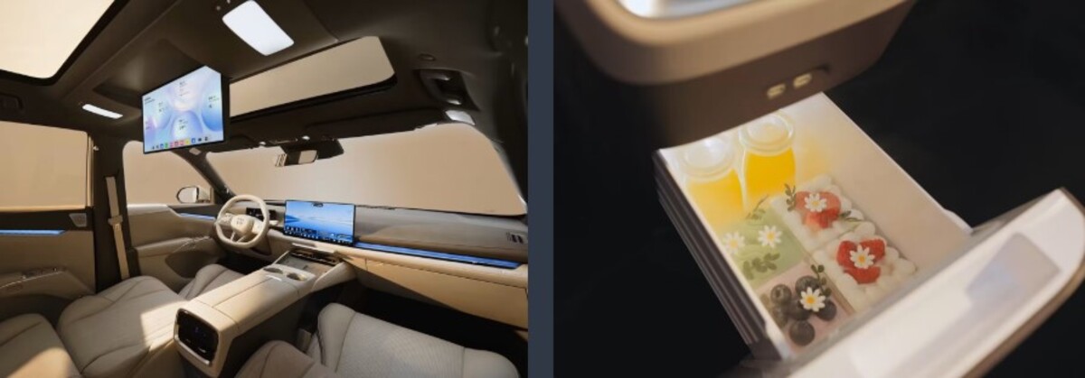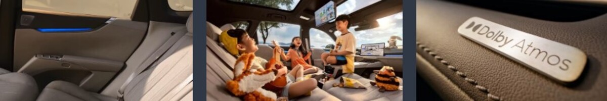 Задні пасажири отримують 15,6-дюймовий екран, а аудіосистема з 20 динаміків і Dolby Atmos включає верхні модулі та динамік у підголівнику водія. Є задній столик, безліч USB-портів для зарядки, м’яке стельове освітлення для зменшення напруження очей і контрольований за температурою відсік для зберігання речей від 2 до 50 градусів за Цельсієм.