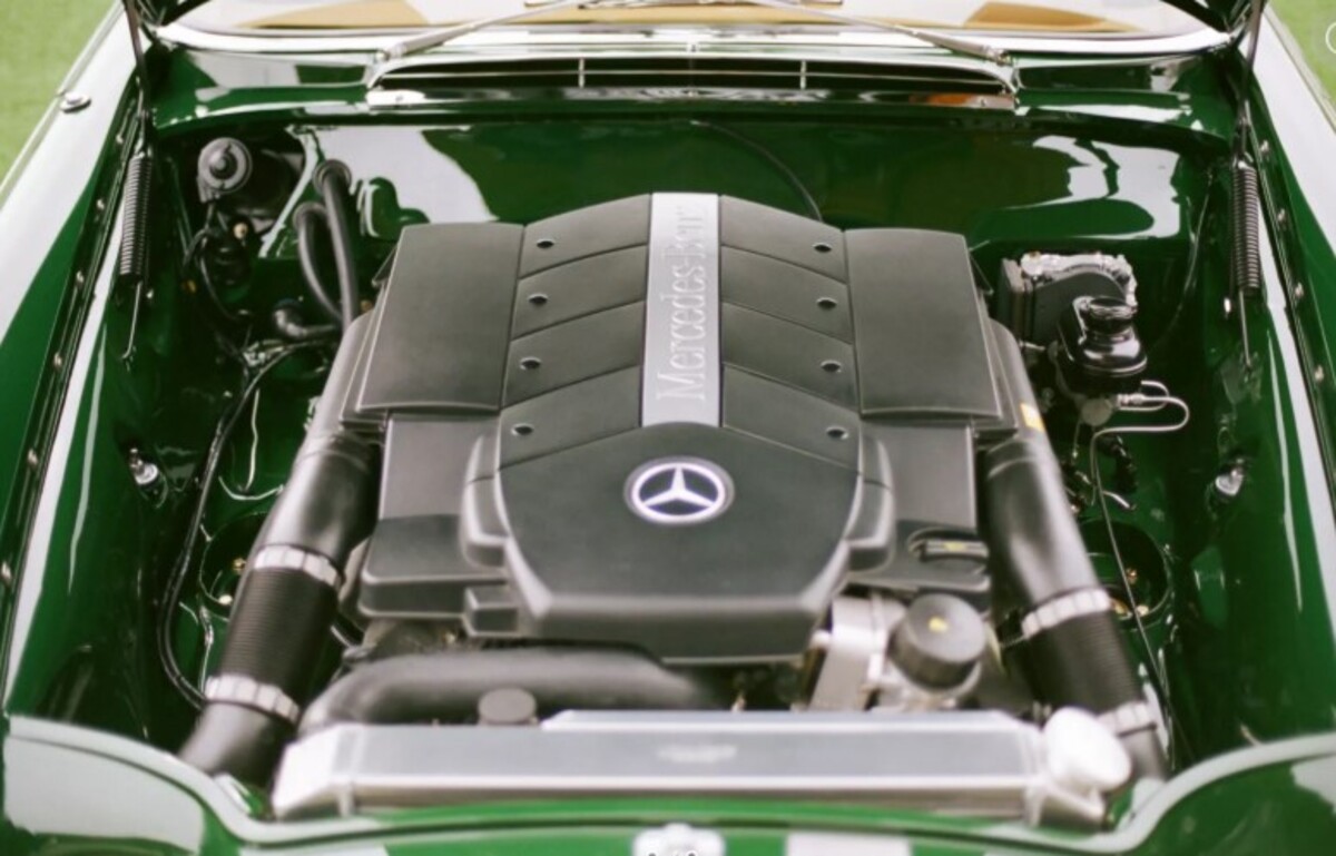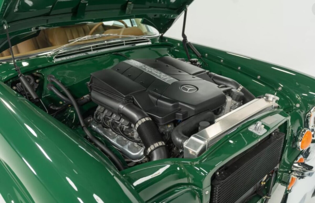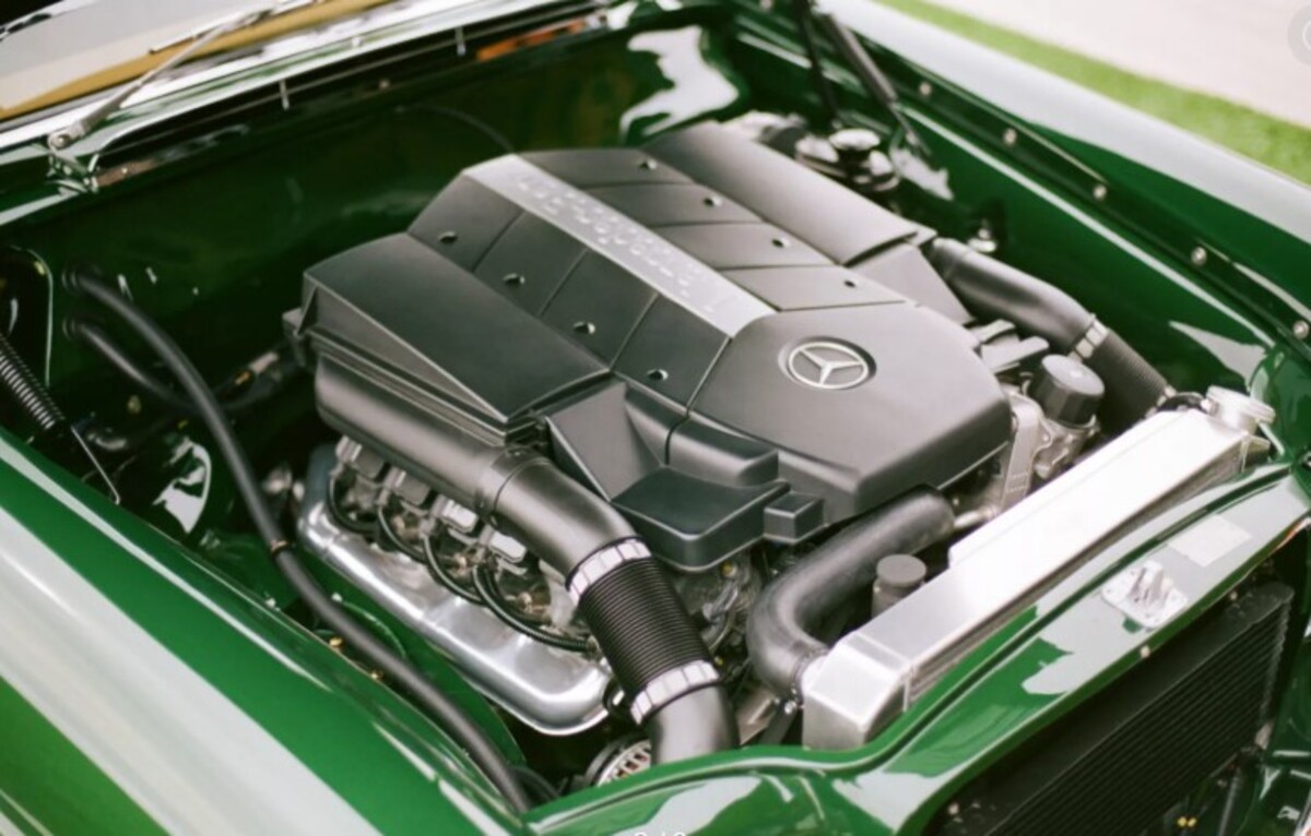Найбільша модернізація торкнулася двигуна. Оригінальний мотор замінили на 5,4-літровий атмосферний V8 з сучасного Mercedes C55 AMG. У свій час цей двигун видавав до 367 к.с. та 510 Нм крутного моменту — значно більше, ніж пропонував класичний 280SE. Крім того, встановлено нову електропроводку, кастомний паливний бак, радіатор та нержавіючу систему вихлопу.