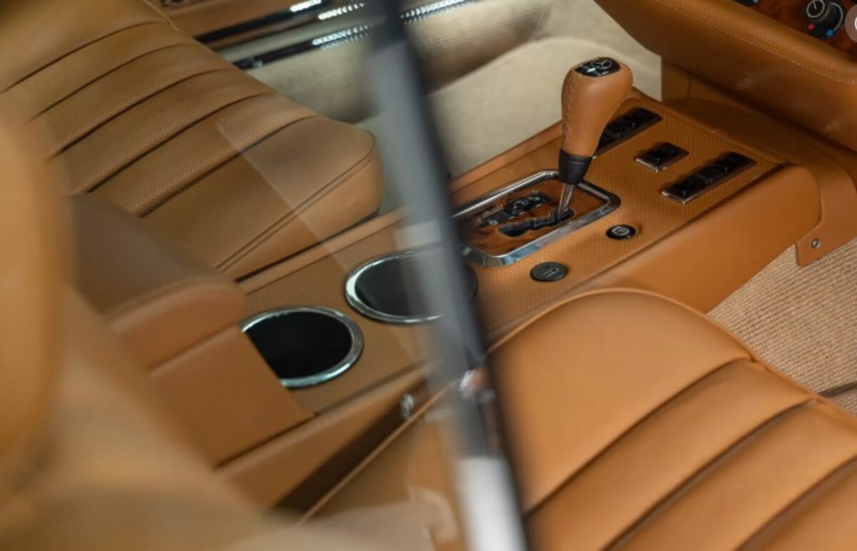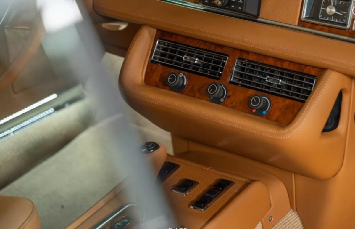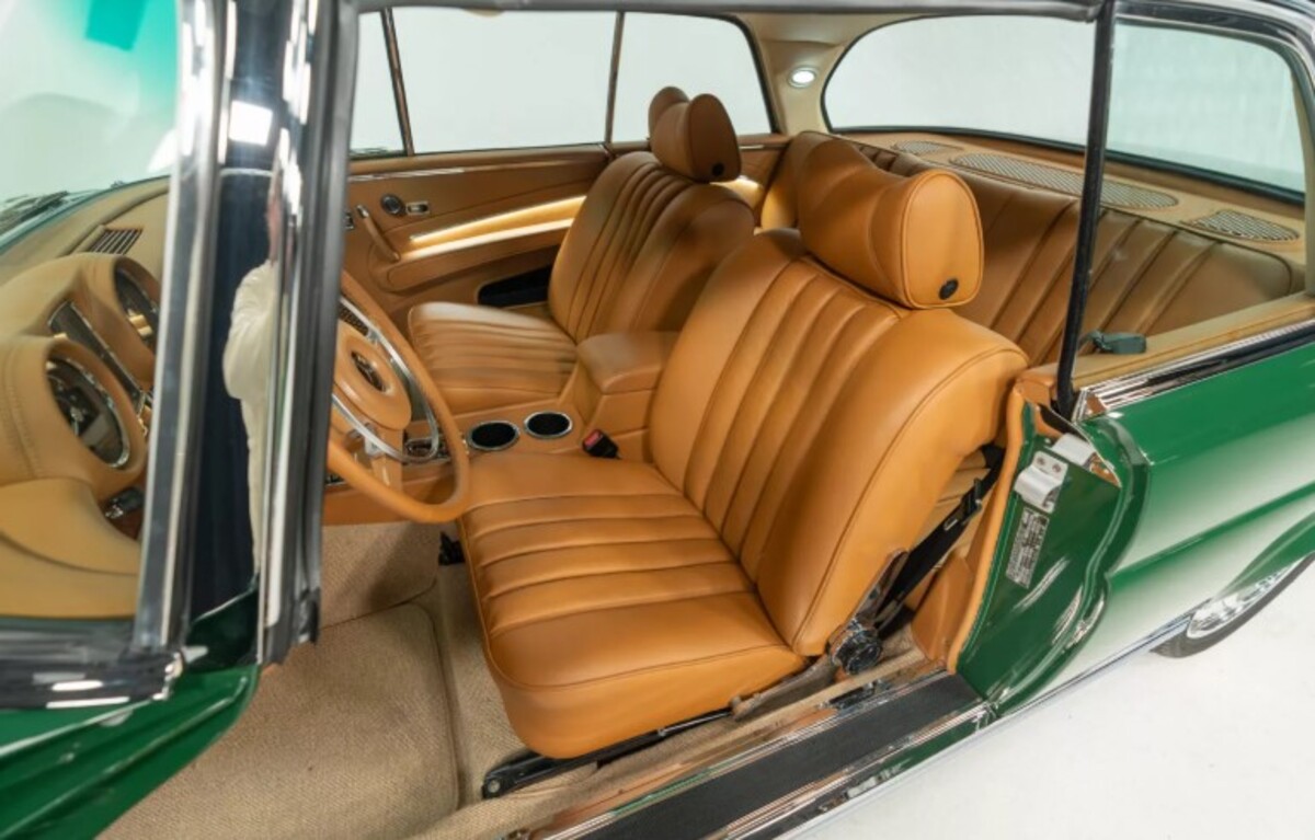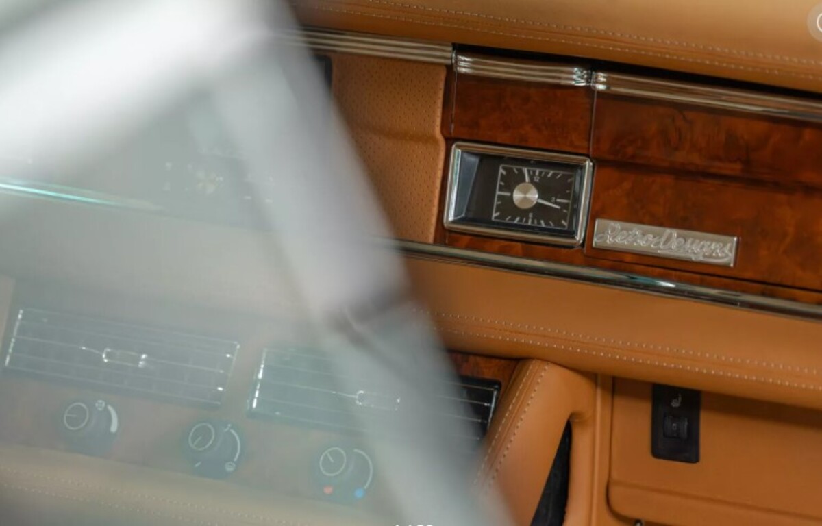 Інтер’єр майже повністю оригінальний. Retro Designs перетягнула салон новою коричневою шкірою, додала сучасні перемикачі та оновлені дерев’яні вставки по всьому салону. Тунель коробки передач, кермо та важіль залишилися оригінальними. Перше, що відразу кидається в очі, — невелика аудіосистема JL Audio у центрі панелі.