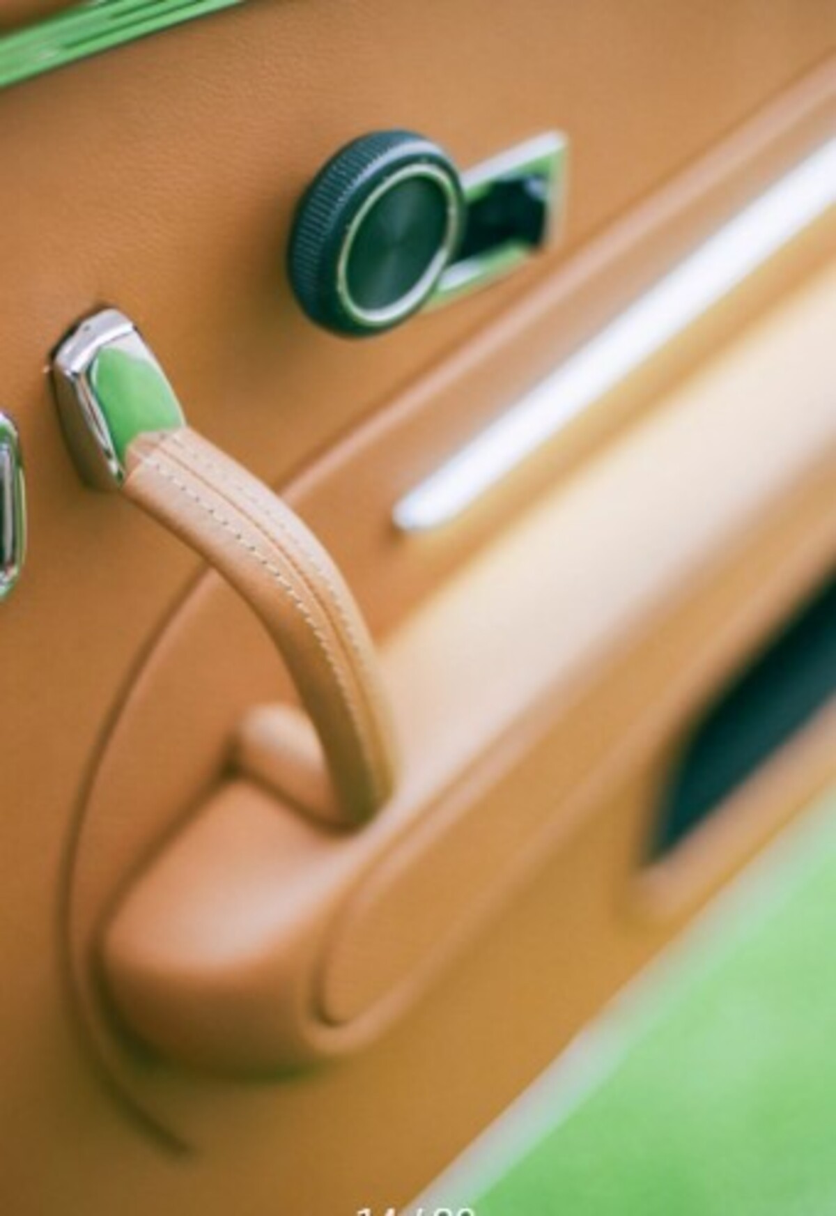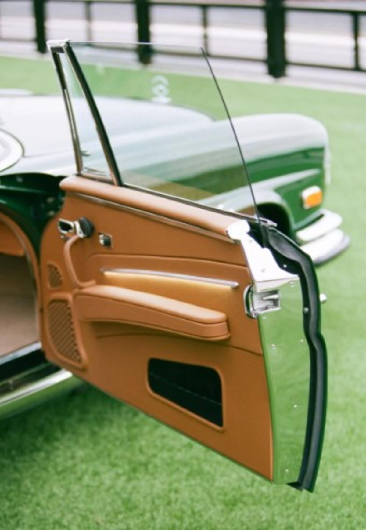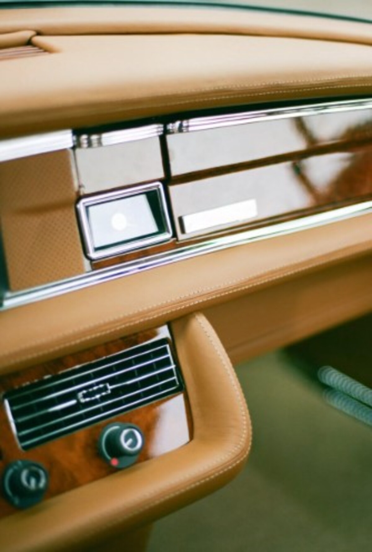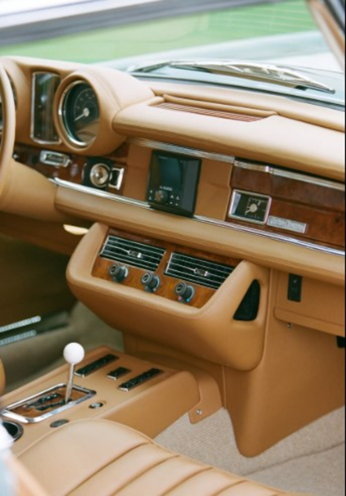 Інтер’єр майже повністю оригінальний. Retro Designs перетягнула салон новою коричневою шкірою, додала сучасні перемикачі та оновлені дерев’яні вставки по всьому салону. Тунель коробки передач, кермо та важіль залишилися оригінальними. Перше, що відразу кидається в очі, — невелика аудіосистема JL Audio у центрі панелі.