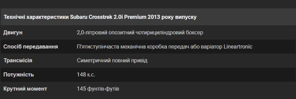 Сьогодні на вторинному ринку можна знайти Subaru XV Crosstrek Premium 2013 року приблизно за суму від середини 9 тисяч доларів.