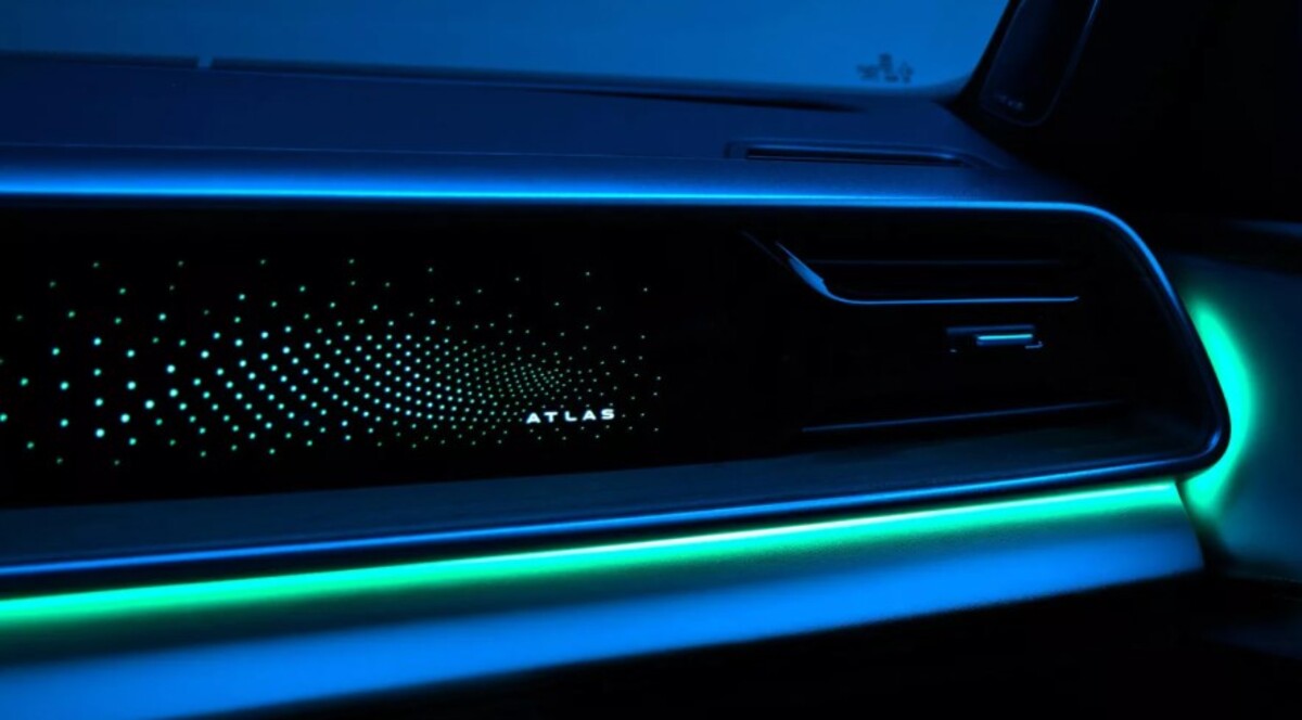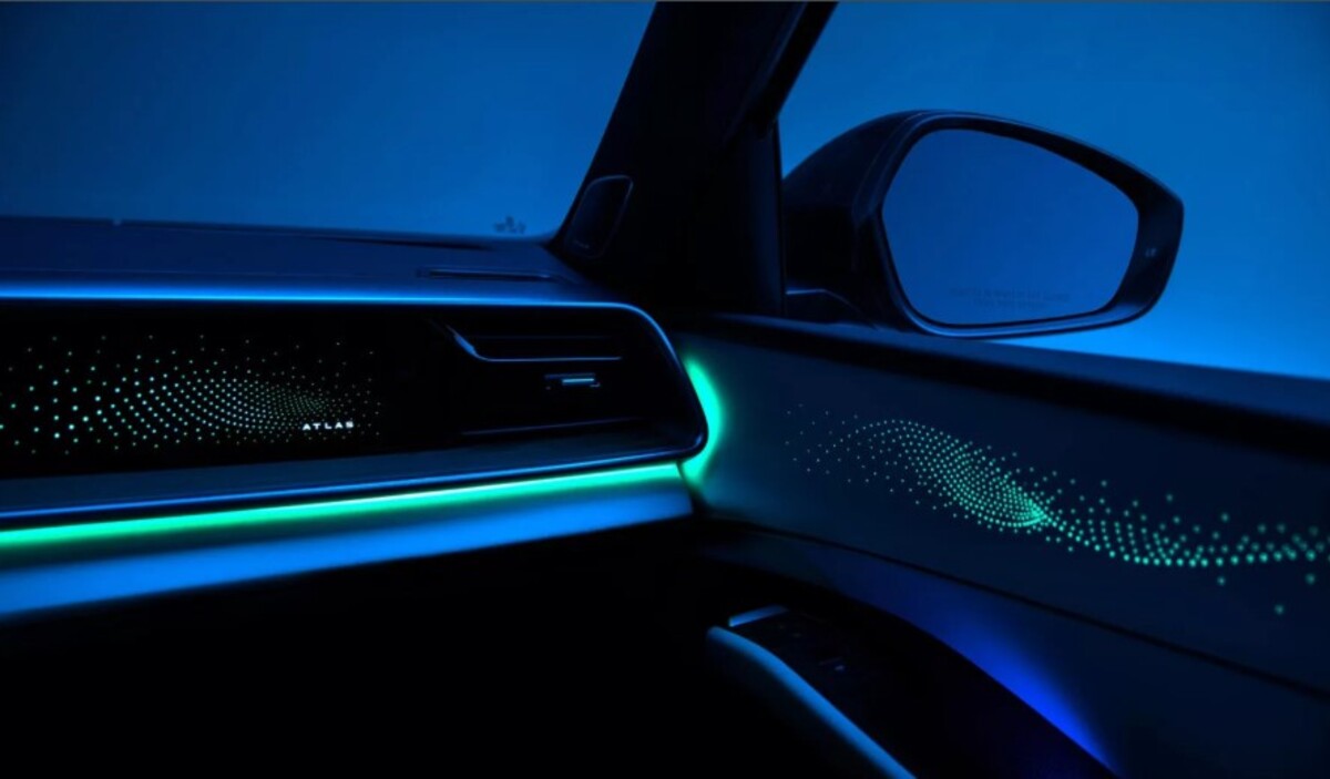 Також на тизері видно елементи аудіосистеми з яскравими решітками динаміків біля основи передніх стійок. Це натякає на використання преміального звуку в новому Atlas.