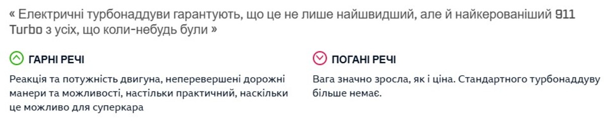 Porsche 911 Turbo S залишається одним із найкращих універсальних суперкарів. Він поєднує екстремальну швидкість, сучасні технології та комфорт для щоденного використання.Так, він став трохи спокійнішим за характером, але натомість отримав більше стабільності, контролю та ефективності. Це автомобіль, який однаково добре підходить і для міста, і для швидкісних трас, і для треку.