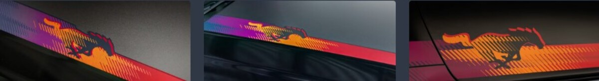 Вони обігрують фірмовий логотип «поні» і ніби «розтягуються» по кузову, створюючи ефект гоночного боліда, а не серійного автомобіля.